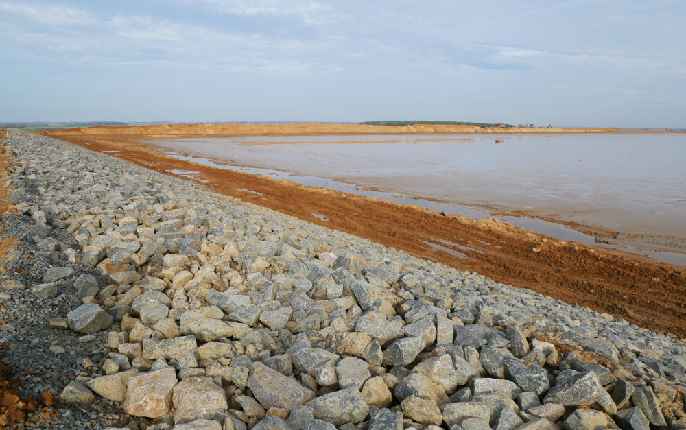 Скальные породы представляют собой куски скальных пород неправильной формы и разного размера. Такие породы характеризуются высокой прочностью, морозостойкостью и водостойкостью. Укрепление откоса дамбы скальной породой играет ключевую роль в возведении дамбы шламохранилища. При укладке формируется жесткий каркас, который повышает устойчивость сооружения к нагрузкам и деформациям, который защищает откосы дамбы от разрушения под действием волн, осадков и потоков жидкости.