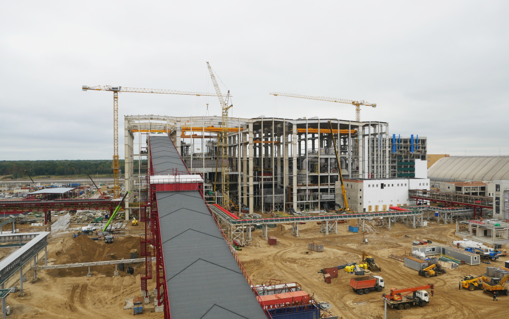 На данном этапе интенсивно ведутся работы по устройству полов в отделении растворения. Подходят к завершению работы по укладке кровельного материала. Продолжаются работы по монтажу технологических трубопроводов. Полностью завершена сборка металлического каркаса зданий и ведется активная подготовка фронта работ для установки фасадов.